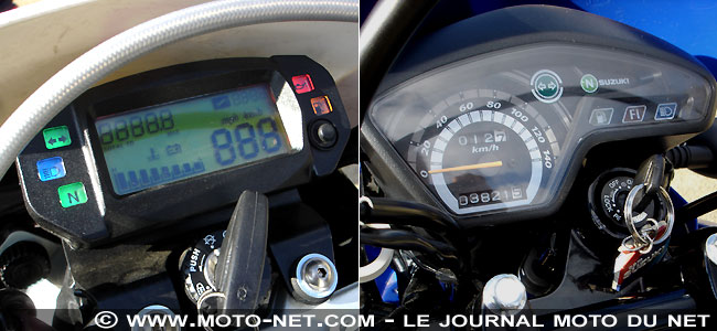 En premier lieu, si sa sportivité moins exacerbée peut la desservir à la sortie du lycée, elle propose quelques aspects pratiques bienvenus. Ainsi, son pilote prend place sur une selle plus large et ô combien plus moelleuse que celle de sa rivale, tandis que le passager de la Suz' est le seul à profiter d'une poignée de maintien et de repose-pieds recouverts de caoutchouc.