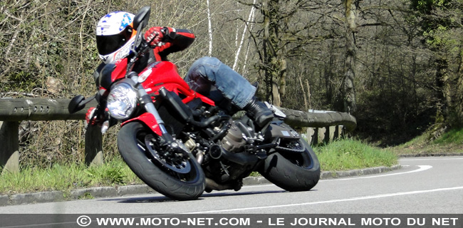 Plus sensible aux interventions sur les freins ou l'accélérateur dans les virages, la F800R est aussi plus sereine lorsqu'on enroule sur routes dégradées. Ses suspensions plus souples (même en mode ESA "Sport" qui limite les mouvements de suspensions via une hydraulique davantage fermée) encaissent mieux les bosses et les creux que celles, plus raides, de la Monster.