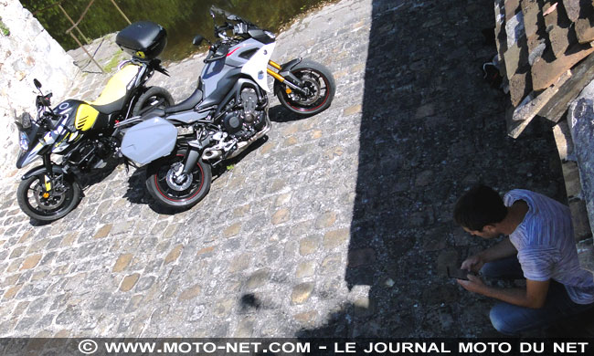 | GT pas contre moins de vibrations… Le 3-cylindres et le bicylindre ont en commun une certaine propension à vibrer dans les tours. Faute de caoutchouc sur ses repose-pieds, la Tracer 900 GT chatouille désagréablement les bottes dès 5000 tr/mn, avant de s'étendre aux mains. La V-Strom 1000', dotée de caoutchouc avant-arrière, est plus bienveillante à ce niveau. On apprécie en revanche la sobriété de chacune : de 5,39 à 6,57 l/100 km pour la Yam' et de 4,71 à 5,64 l/100 km pour la Suz' mesurés par MNC pendant ce duel en mode "balade". |