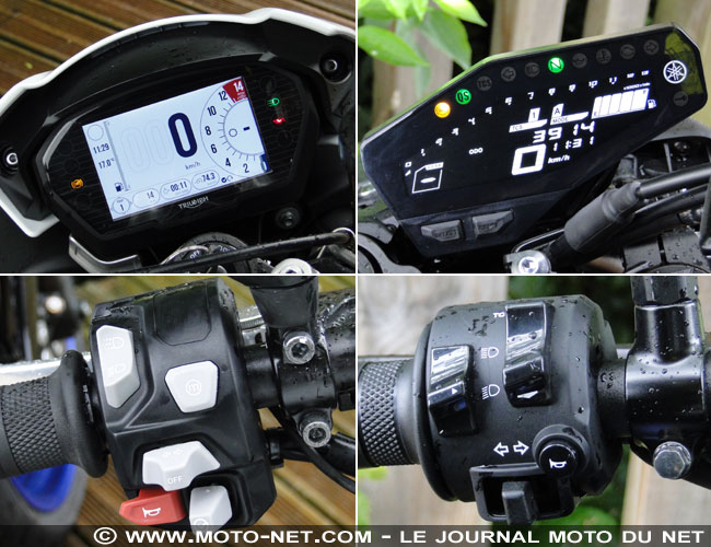 Tableaux de bord. Cette comparaison est assez explicite : l'instrumentation en couleurs de la Street Triple R est clairement supérieure à celle - monochrome - de la MT-09 SP ! Mais les deux regorgent d'informations : rapport engagé, deux trips, consommations moyenne et instantanée, autonomie, température de l'air et du moteur, jauge à essence, heure. Complet et lisible dans les deux cas, pour ne rien gâcher.