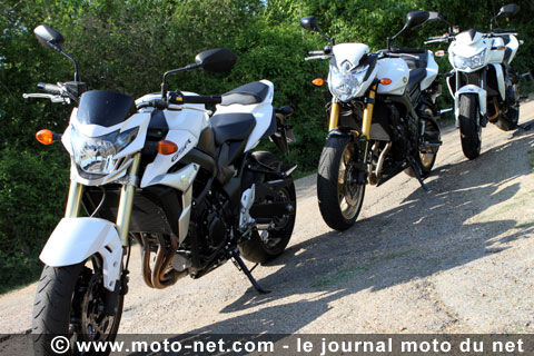 Placée à la même hauteur sur les trois machines (815 mm), la selle de la Suzuki est facile à enjamber et son excellente maniabilité lui permet de se faufiler dans un trou de souris en agglomération. Elle se montre de surcroît facile à vivre en ville grâce à une inclinaison du buste et un repli des jambes nettement moins prononcés que sur la Z750, même si sur ce point la FZ8 conserve l'avantage avec sa position droite quasi sénatoriale.