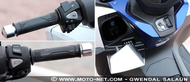 Son niveau d'équipement est équivalent, avec un vide-poche gauche muni d'une prise 12 volts et acceptant une petite bouteille d'eau, un spacieux coffre sous la selle de 48 litres capable de loger sans peine deux casques intégraux (avec un séparateur déplaçable qui permet de moduler l'espace de rangement selon les besoins).