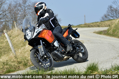 Affublée de ses pneus off-road, la 1190 Adventure perd en termes d'agilité mais se joue du terrain parsemé de cailloux grâce aux tétines. La précision du train avant - chirurgicale sur route avec les pneus Continental - est également en retrait, mais l'électronique de la KTM parvient à maintenir un très haut niveau de prestation.