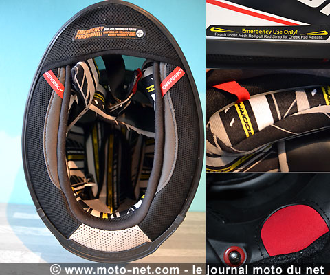Grâce à ce système, les secouristes peuvent ôter très facilement les rembourrages latéraux en tirant sur les languettes rouges placées de chaque côté, afin de retirer le casque en douceur sans forcer sur une zone cervicale souvent fragilisée lors un accident.