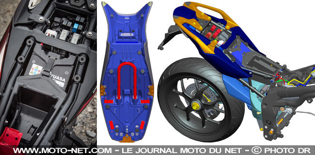 D'autres points améliorent tout de même la vie du motard au quotidien. À la demande express des Frenchies - encore eux ! -, les ingénieurs anglais ont réussi à ménager un espace de 1,6 litre pour loger un bloque-disque (pour ceux qui ne se contenteraient pas du U spécifique calé sous la selle et de la clé codée), un kit anticrevaison et d'autres gadgets utiles.
