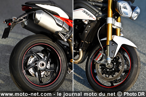 En outre, le dessin exclusif de ses nouvelles roues permet à la Speed R de se différencier du modèle classique. Parallèlement, Triumph a le bon goût de chausser son nouveau roadster de gommes très sportives : des Pirelli SuperCorsa SP (contre des Metzeler Interact K3 sur le Speed Triple "tout court").