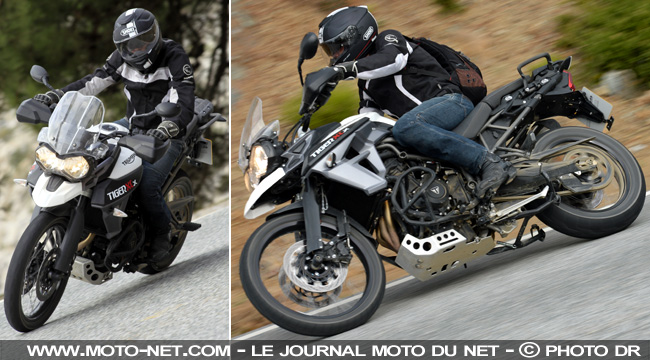 Que ce soit hors piste ou sur route, la Tiger 800 XCx permet d'envisager de longs périples. Exempte de vibrations - celles perceptibles dans le grand guidon ne sont absolument pas gênantes -, la moto dispose d'une selle accueillante, y compris lorsque le pilote se tient debout, les genoux plaqués contre le réservoir les embouts de la selle, justement.