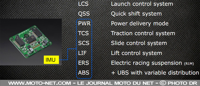 Grâce à lui, le tangage, le roulis et le lacet de la moto sont constamment mesurés, de même que les accélérations sur les axes avant/arrière, gauche/droite et haut/bas. Autant de données qui permettent au fameux ECU, le cerveau de la R1, d'ajuster le volume d'essence injecté, le calage d'allumage et l'ouverture de papillons des gaz.