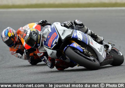 Hélas, lorsque ses pneus ont commencé à se dégrader, Dani Pedrosa s'est retrouvé aux commandes d'une Honda à la fois nerveuse en entrée de courbes et délicate à gérer en sortie, tandis que la Yamaha de son rival continuait à avaler les virages comme posée sur un rail. Dépassé par Lorenzo à six tours de l'arrivée, Pedrosa ne pouvait plus répliquer...