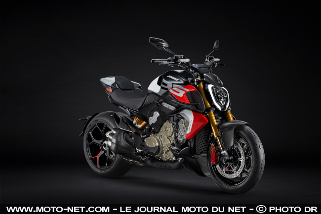 - En bref : Le "Diable" de Bologne récupère le V4 de 1103 cc des Panigale pour affoler les compteurs (et les prix !), à grands renforts également de suspensions Öhlins, freins Brembo et jantes forgées haut de gamme. Son habillage carbone reçoit une déco spécifique à cette crapuleuse version RS.