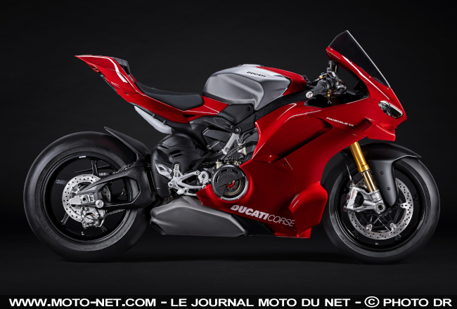 - En bref : La V4 R est la Panigale homologuée par Ducati pour le mondial Superbike, d'où sa cylindrée ramenée à 998 cc au lieu de 1103 cc sur les Panigale de "grande série" (hum, hum !). Une bête de course capable d'atteindre 330,6 km/h avec le Kit Racing, dotée d'une géométrie modifiable dans tous les sens et de composants de compétition. Fourche Öhlins NPX25, amortisseur TTX36, jantes Marchesini, étriers Brembo HyPure : la recette gagnante pour claquer un chrono... et son PEL !