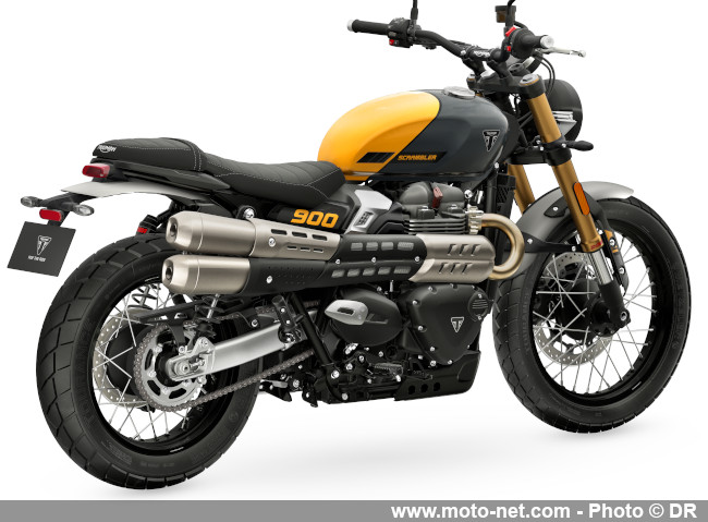 - En bref : Le Scrambler 900 - sur base de Bonneville T100 - gagne un nouveau bras-oscillant en alu pour gratter 2 kg, une fourche inversée Showa et de nouvelles jantes à rayons plus légères. Le freinage et l'électronique sont également améliorés par le truchement d'une centrale à inertie.