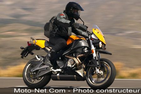 Son équipement routier original semble également assez séduisant pour faire de longs trajets : le saute-vent traditionnel des Buell XB est surmonté d'une petite bulle transparente, le guidon est paré de protèges mains et le système Triple-Tail apparaît comme une véritable innovation : cette tablette derrière la selle peut servir alternativement de dosseret pour le passager et de porte paquets quand il est rabattu vers l'avant sur la selle ou vers l'arrière sur la coque en duo.