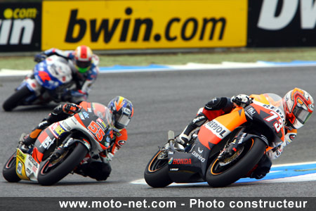 Rendez-vous dans deux semaines à Valence pour la dernière épreuve, le 29 octobre ! En 250, Dovizioso qui ne lâche rien aura fort à faire pour prendre 13 points à Lorenzo devant son public, mais Estoril a montré que rien n'était jamais joué en compétition moto : demandez donc à Sébastien Charpentier ce qu'il en pense, lui qui a pris le titre Supersport juste à la dernière course grâce à la faute de Curtain (lire Moto-Net du 9 octobre 2006).