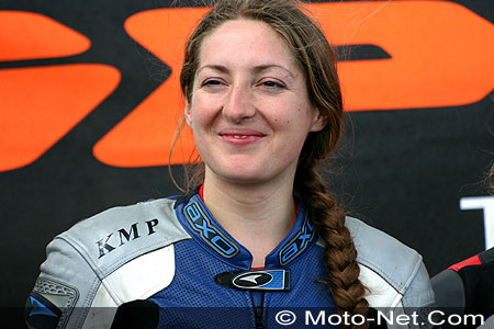 Elle relègue ainsi à près de deux secondes les deux autres pointures, Evelyne Roques, ancienne gagnante du Trophée féminin en 1993 (Honda 600 Hornet n°95, 1'12.582), et Magalï Langlois (Yamaha 600 Fazer n°67, 1'12.831), 26ème scratch au Mans cette année (lire Moto-Net des 3 et 4 avril 2004) et qui prendra le départ du Bol d'Or au guidon d'une Yamaha R1 2004 (lire Moto-Net du 26 avril 2004).