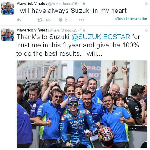 Sans rancune non plus, Suzuki a de son côté pris acte de la "fin de sa collaboration avec Maverick Viñales à la fin de la saison Moto GP 2016", souhaitant au jeune espagnol "un avenir brillant et plein de succès".