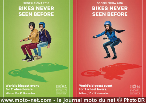 Le programme du salon italien n'a pas encore été dévoilé mais la campagne de publicité a débuté dès le mois de mars : focalisée sur les nouveaux produits logiquement absents des affiches - "des motos jamais vues avant", titrent les organisateurs ! -, elle doit attirer l'oeil des motards... mais pas seulement !
