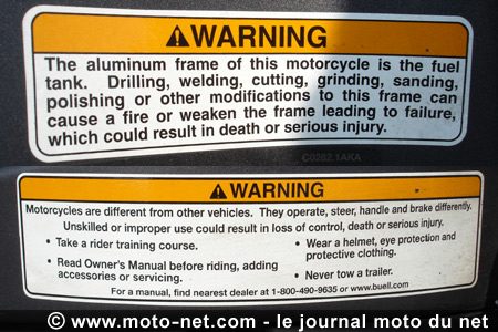 Subissant la tradition américaine également, Erik Buell n'oublie pas de promulguer à ses clients ses habituels avertissements : "le cadre faisant office de réservoir, il est déconseillé de le trouer, souder, couper, rectifier, poncer ou polir car cela pourrait l'enflammer ou l'affaiblir puis le casser, ce qui pourrait entraîner la mort ou de graves blessures". Damned !
