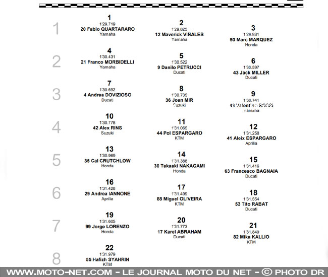 Valentino Rossi, justement, se qualifie au 9ème rang derrière Andrea Dovizioso et devant Alex Rins. Pol Espargaro place quant à lui sa KTM à la 11ème place pour son retour de blessure au poignet. Jorge Lorenzo, lui, continue à évoluer loin de son niveau : 19ème à presque deux secondes de la pole...