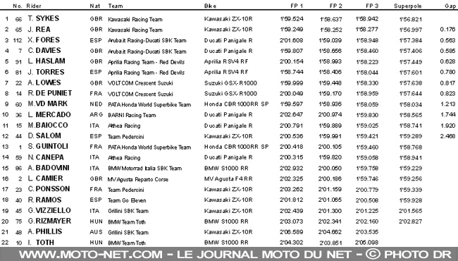 Derrière notre "Numéro Un" mondial et sa CBR1000RR se placeront Niccolo Canepa sur sa Panigale n°59 (Ducati Althea) et Ayrton Badovini sur sa S1000RR n°86 (BMW Italia). Deux pilotes aussi expérimentés que bagarreurs dont Guintoli devra se défaire rapidement lors des deux départs demain !