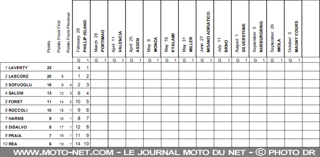 La prochaine course, justement, se disputera à Portimao, jardin du team Honda Parkalgar de Laverty... Doit-on s'attendre un nouveau cavalier seul de l'irlandais ? Mystère...