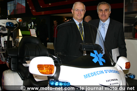 Jouxtant le podium sur lequel pose la nouvelle version de la Goldwing se trouve un prototype : une autre Goldwing stickée "Médecins d'urgence" et équipée de gyrophares... Un modèle qui préfigure peut-être de ce que sera les prochains véhicules d'urgence médicalisée !