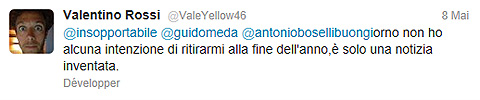 " Je n'ai aucunement l'intention de me retirer à la fin de l'année, c'est juste une information inventée ". Valentino Rossi a ainsi démenti sur son compte Twitter l'affirmation du quotidien britannique The Telegraph , selon laquelle le nonuple champion du monde comptait prendre sa retraite à la fin de la saison 2012.