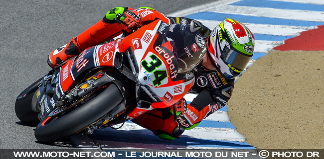 Une fine pluie et les deux Kawasaki officielles n'ont pas réussi à faire plier Chaz Davies cet après-midi (cette nuit !) sur la piste de Laguna Seca. Le pilote gallois était encore le plus rapide et offre à la 1199 Panigale son premier doublé en World Superbike.