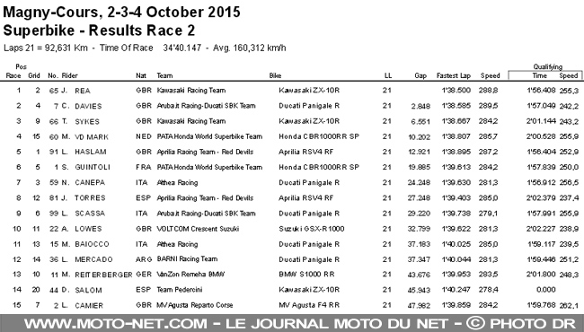 Titré dès la première manche à Jerez, Jonathan Rea obtient son cinquième doublé de la saison. Le champion 2015 totalise 528 points sur 600 maxi ! Loin derrière, la bataille pour le "titre" de vice-champion s'intensifie entre Sykes et Davies : arrivé en France avec 22 points d'avance, Davies en repart avec 16.