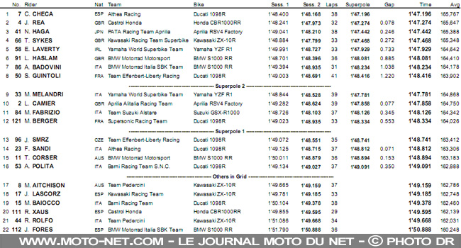 Stoppé dans son bel élan en Superpole 2, Maxime Berger et sa 1098 s'assurent la 12ème place sur la grille derrière Michel Fabrizio et Leon Camier. La surprise nous vient de Marco Melandri, qui devra se contenter de la 9ème place sur la grille. Or pour rester - mathématiquement - dans la course au titre, le n°33 ne doit pas lâcher plus de 25 points à Carlos Checa...