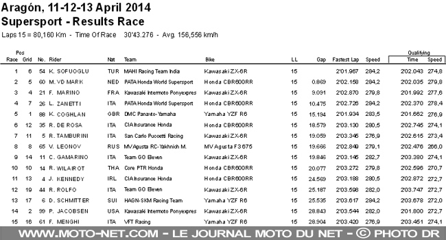 En tête de la course, Kenan Sofuoglu s'applique : le Turc ne possède qu'une petite seconde d'avance sur Michael van den Mark mais la conserve jusqu'à la ligne d'arrivée ! Huit secondes plus tard, Florian Marino déboule à son tour sous le drapeau à damier et s'offre une superbe troisième place.