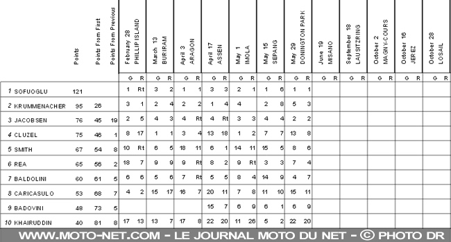 Au classement provisoire, le quadruple champion du monde totalise 121 points et compte désormais plus d'une victoire d'avance sur son coéquipier Randy Krummenacher (95 points) et presque deux sur Jacobsen (76) et Cluzel (75). Smith, Rea et Baldolini se battent pour la cinquième place.