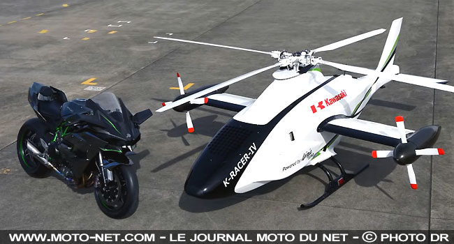 Ce K-Racer IV décolle et atterrit à la verticale comme un hélicoptère classique via son rotor de 4 m, mais pourrait aussi voler "à grande vitesse" grâce à ses hélices en bout d'aile qui remplacent le rotor de queue. Intéressante démonstration de passerelles tendues entre différentes branches du groupe Kawasaki Heavy Industries (KHI).
