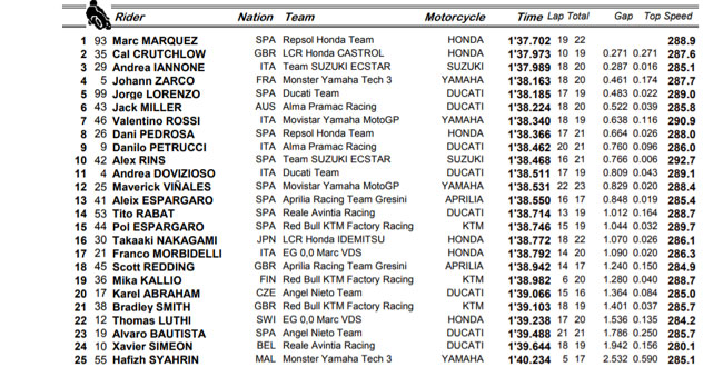 Le n°93, qui évoque Pedrosa et Dovizioso comme coéquipiers possibles en 2019, devance Cal Crutchlow, Andrea Iannone et Johann Zarco, quatrième à 0,461 sec et premier pilote Yamaha. Jorge Lorenzo se hisse au 5ème rang devant Jack Miller. Valentino Rossi, septième à 0,638 sec, peine à dissimuler sa déception quant au manque de progrès de sa M1 2018 sur ce circuit considéré comme un juge de paix. Rappelons que les problèmes des Yamaha d'usine s'étaient manifestés à Jerez l'an passé, mettant en évidence des soucis de motricité sur ce tracé à faible adhérence...